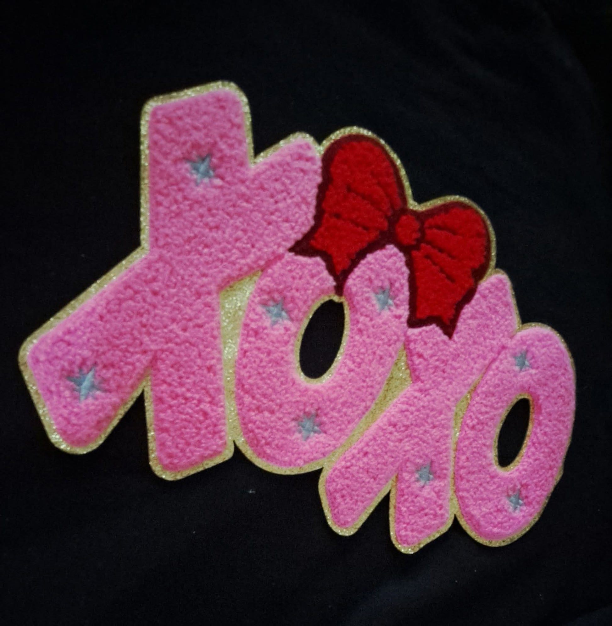 XOXO chenille patch pink with red bow backed in gold glitter